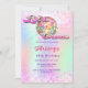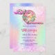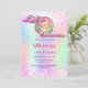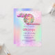 A girly and feminine 18th (or any age) party invitation. A holographic background in pink, purple and mint green. Decorated with a colourful disco ball and pink confetti. Text: Let's Dance. Personalise and add a name and party details. The name is written with a hand lettered style script.
