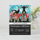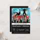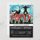 A fun design of a large crowd dancing beneath two dancers jumping into the air. The background is filled with flashing white lights and blue strobes and below the dancers is the word party in large red letters.