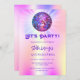 A girly and feminine Quinceañera party invitation. A holographic coloured background in purple, pink, yellow, blue. Decorated with a colourful disco ball. Text: Let's Party! Personalise and add a name and party details. The name is written with a hand lettered style script, purple coloured letters.