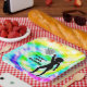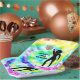 A cool plate with a tie dye background and a disco woman silhouette with custom wording. Great for any age birthday party.