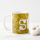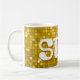 Mug with a fun and funky stylised "disco mirror tile look" printed pattern in shades of yellow gold and white, and retro style text. Can be used as a background for your own text, images and ideas. Please note this is a printed digital art image, it does not shine or contain real mirrors or glitter.