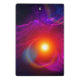 A digital image of the sun and ascending bands of solar winds in bold vibrant colours.