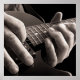 This hyperrealist oil painting by Jeff Bartels features a man playing the electric guitar. The closely cropped, black and white image depicts the man's left hand high up on the fret board as if playing very high notes. Strong light and shadows along with the tight cropping gives this painting a striking and dramatic feel.