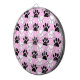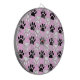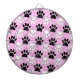 A pattern in black and white of dog paw prints with distressed effects on a pink background.