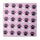 A pattern in black and white of dog paw prints with distressed effects on a pink background.