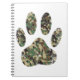 A camo dog paw print cartoon style with distressed effect applied to image. Custom notebooks.