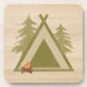 A distressed depiction of a campsite with tent, trees and campfire in wood. Hikers and Campers can appreciate the cosiness of a campsite deep in the woods. For nature lovers and back woods travelers.