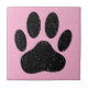 Cartoon dog pawprint in black. Distressed effect applied to the image. Pink background version.
