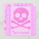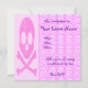 Custom two-sided invitation cards. Front has customisable "You're Invited". Back has invitation information--enter your event title, date, time, location, and additional info or personal message. Pink skull and crossbones, with lavender eye patch with a pink heart, and a lavender bandanna with a heart pattern. Cute pink pirate skull.