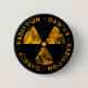 Black button pin with severely distressed yellow radiation symbol and warning text.