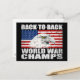 A classic vintage patriotic postcard, with a distressed worn look. This design features a U.S. Flag, an American Bald Eagle, and the popular funny saying, "Back To Back World War Champs". The perfect patriotic postcard for Memorial Day party invitations, or for any patriotic occasion! Grab yours from this American Zazzle Pro Seller today, and send it with pride.