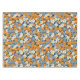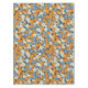 A vibrant floral pattern covers the entire image. Small, stylised flowers in shades of orange, light blue, and off-white are densely arranged on a navy blue background. The flowers have a slightly imperfect, painterly appearance, with variations in colour saturation and shape that give the pattern a textured, almost hand-painted look. The repeated pattern creates a cheerful and busy visual effect.