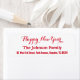Custom, personalised, elegant, festive red typography / script, Happy New Year / Merry Christmas / Happy Holidays return address label. Simply enter the family name / bride & groom's / wife & husband's names, and address, to customise.