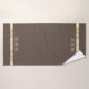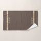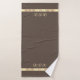 Personalise this Bath Towel Set with your monogram in fancy gold script and name on brushed gold stripes on brown background.