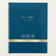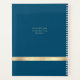 Personalise this Black Planner with your monogram in fancy gold script, name, title, year with contact info and extra text on back. Gold text on Dark Blue background with brushed gold stripes.