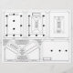 white background, black guidelines, marks, circle holes to cut out, black lined boxes for Velcro / hook & loop, seam allowance guidelines to fold under