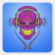 An elaborate DJ sugar skull design decorated with intricate swirls and dot patterns. Headphones sit on top of the skull with two wires hanging below. The complex lines and circles are solid black while the interior of the skull is finished with a deep highlighted purple and vibrant yellow. Music blasts out of the headphones in the form of black lightning bolts. A shadow falls onto the bright blue background making it look like the skull is sitting just above the surface of the sticker. This aggressive Day of the Dead inspired image is a colorful representation of DJ culture.