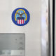 This Round Magnet is decorated with the Defence LOGISTICS Agency logo .