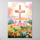 A peaceful watercolor landscape at dawn with soft pastel skies, featuring floral cross the inspirational phrase "Do Everything In Love" in elegant calligraphy.