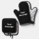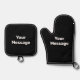 You can create your own message in white text on this black oven mitt and pot holder set.