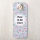 Please do not disturb door hanger with a pattern with a fun summery vibe. Pink flamingos and pineapples set on a light blue striped pattern with leaves and hearts all around.
