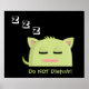 A cute and funny illustration of a sleeping kitty cat character. Coloured green with pointy ears and little tufts of hair on top of her head with expressionless pink lips and a pointy tail. Eyes closed, sleeping soundly and snoring with some zzz's above her head. DO not disturb.