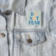 This button has peaceful colours, including a light green background, blue letters and peach coloured flowers. A reminder not to be afraid, a sentiment repeated many times in the Bible.