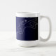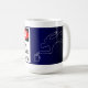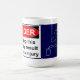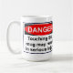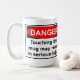 Danger! Touching this mug may result in serious injury. Funny mug with a warning sign on one side, and the outline of a body lying in chalk touching the outline of a mug in chalk on the other. Background is a gradient from dark blue to black. Great office gift!