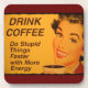 Smiling woman with retro red lipstick and nails drinks her cup of morning coffee. The caption reads "Drink Coffee - Do Stupid Things Faster with More Energy."