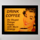 Vintage image of grinning woman with bright red lips holding a cup of her morning coffee. Caption: Drink Coffee Do Stupid Things Faster and with More Energy!"