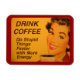 Smiling woman with retro red lipstick and nails drinks her cup of morning coffee. The caption reads "Drink Coffee - Do Stupid Things Faster with More Energy."