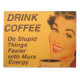 Smiling woman with retro red lipstick and nails drinks her cup of morning coffee. The caption reads "Drink Coffee - Do Stupid Things Faster with More Energy."