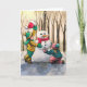 This Holiday card shows two children building a snowman together on a crisp winter day. The original artwork by Cathy Rowe was created using watercolor and a digital inking process.It was inspired by her own memories of childhood in the snow, making a snowman to look like her dad with a pine needle mustache.