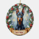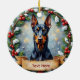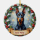 A beautiful, ultra-detailed Christmas ornament design featuring a realistic portrait of the breed centered within a soft, festive winter frame. This elegant design includes pine branches, red berries, and snowflakes against a snowy backdrop, illuminated by warm holiday lighting. The balanced, round composition includes clear space below the dog for customization.