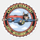 Cartoon super hero "Doberman!" logo, with Doberman flying and "Doberman - Loyal, Intelligent, Brave" in a round emblem. Fun, funny, t-shirts, cards, gifts.