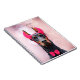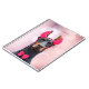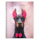 Doberman Pinscher black and brown colored breed type dog wearing bright pink devil horns on a pink headband  and a pink bowtie. Set on a pink bokeh flare background. Personalize with your name or message in black sans font.