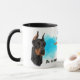 A beautiful portrait of a black and tan Doberman Pinscher Dog is the feature on two sides of this mug. Each image is placed on a bright blue spatter background. Between the two images is the text that describes this loyal and courageous companion, with "the DOBERMAN PINSCHER dog" in black at the bottom. All the text is easily customised to anything you'd prefer; describe your own loyal friend!
