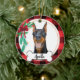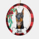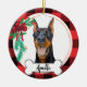 Doberman ornament with red buffalo background and Christmas garland and bow - Art was hand painted by me and made available as this adorable ornament! Add any text (suggested: "I ❤️ my dobie" or your sweetie's name)