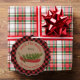 Illustration of a red canoe decorated with Christmas lights with Christmas tree inside. Background is brown cardstock with red and black buffalo plaid border. Personalise the text. Personalise the photo on back.