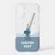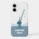 Silhouette of dockyard cargo crane. Vector icon with customisable colour. Custom text.