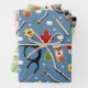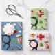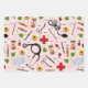 Creative medical-themed gift wrap for doctor featuring healthcare supplies pattern on blue, green, and pink backgrounds.