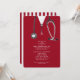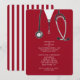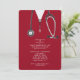 Creative medical school graduation party invites featuring red hospital scrubs and stethoscope art. Edit text to create unique doctor party invitation.