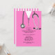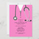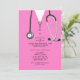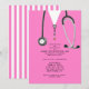 Creative doctor graduation party invites featuring pink hospital scrubs and stethoscope. Edit text to create unique doctor party invitation or medical school grad announcement.