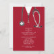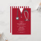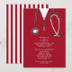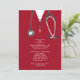 Creative medical school graduation party invites featuring red hospital scrubs and stethoscope. Edit text to create unique doctor party invitation.