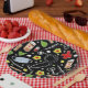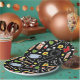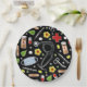 Creative doctor event or medical school graduation party plates featuring healthcare supplies and flowers pattern on black background.