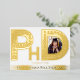 This modern PhD degree graduation party or ceremony invitation (with real foil embossing on the front, and faux gold foil on the back) can be personalised with one of your special photos and event details.