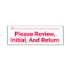 This modern rubber stamp design features the message "Please Review, Initial, And Return", and a line that a signature or initials could be written above. It could perhaps be be used by an educator or an administrative professional to request that somebody review and acknowledge the contents of a document or some other paperwork.