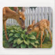 A doe and her fawn stand near a white picket fence, gently nuzzling the lush green leaves of a hosta plant