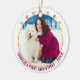 Personalise this photo holiday ornament to celebrate your pet or dog's first Christmas. The template is set up ready for you to add your photo, your dog's name and the year. The design has a colour palette of winter berry, white and gold. The back of the ornament is decorated with a hand-drawn grid in gold. Please browse our store for alternative styles.