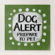 An irreverent and cute typographic animal design that says "Dog Alert, Prepare To Pet". It features black and red text on a white rectangle with funky, playful white dots surrounding it, all on a grey background.